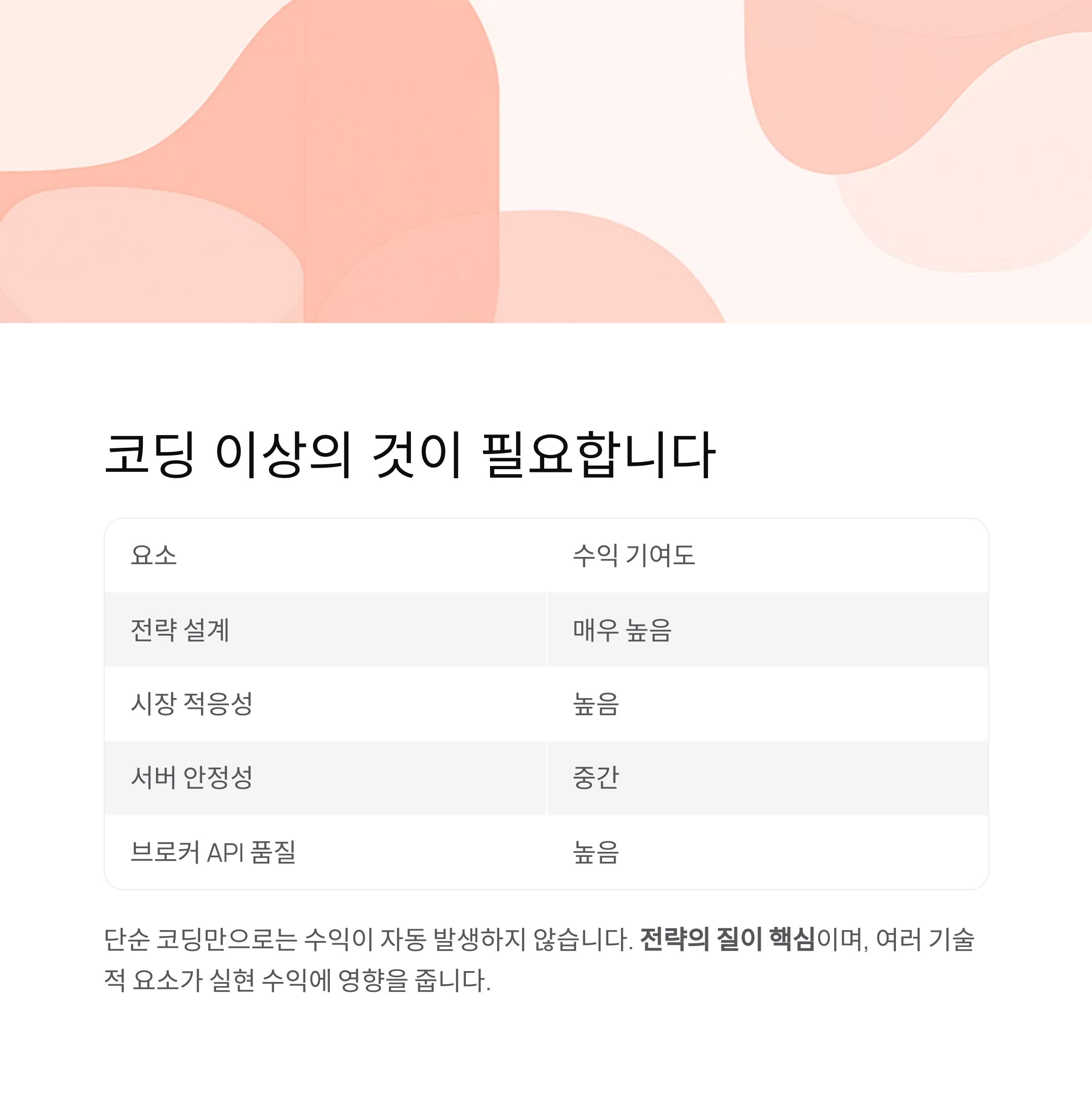 전략의 질이 핵심이며, API 속도, 서버 딜레이, 수수료 등
