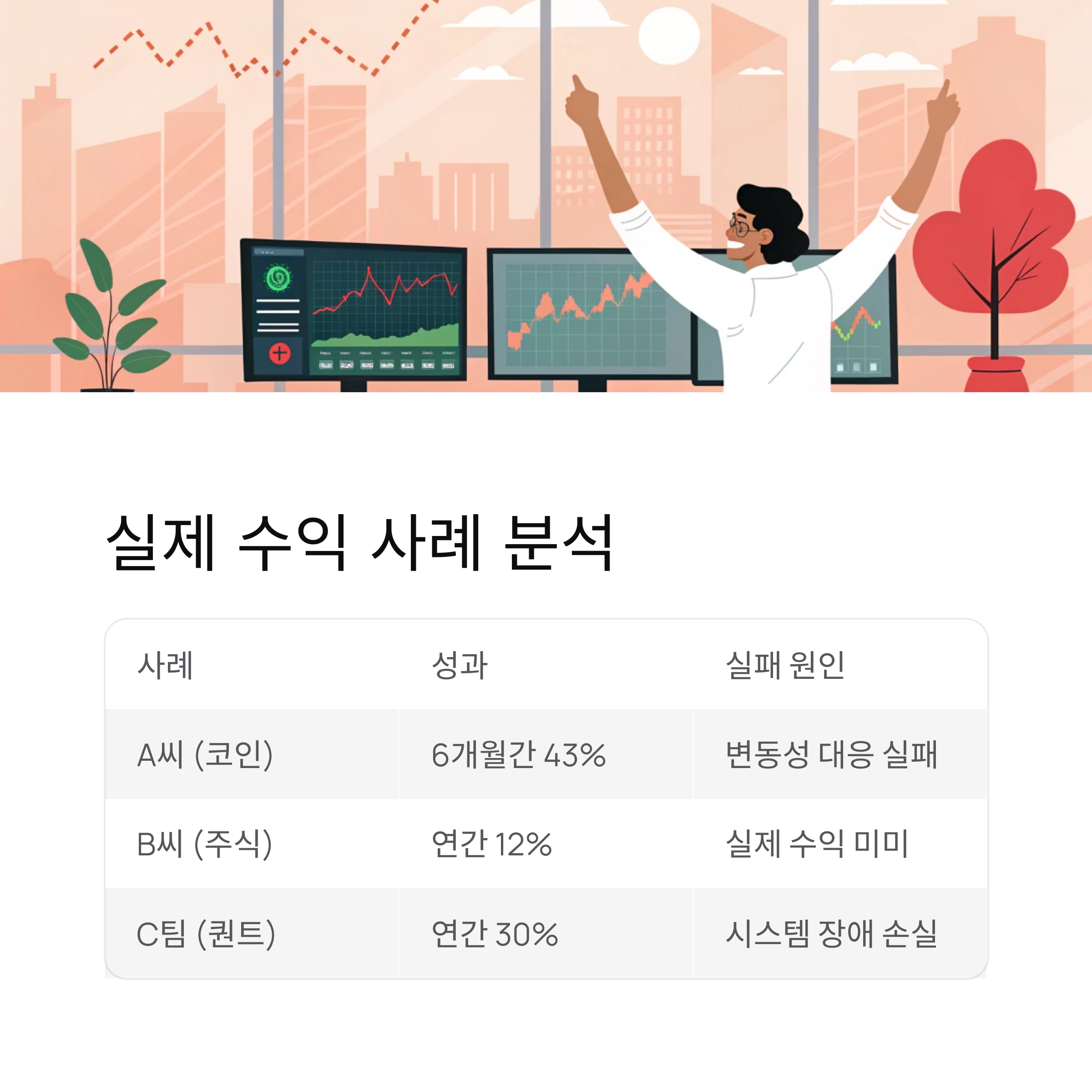 | A 씨 (코인 시장) | 추세 추종 + 볼린저 밴드 | 6개월간 43% | 7개월 차 변동성 급등 대응 실패 |