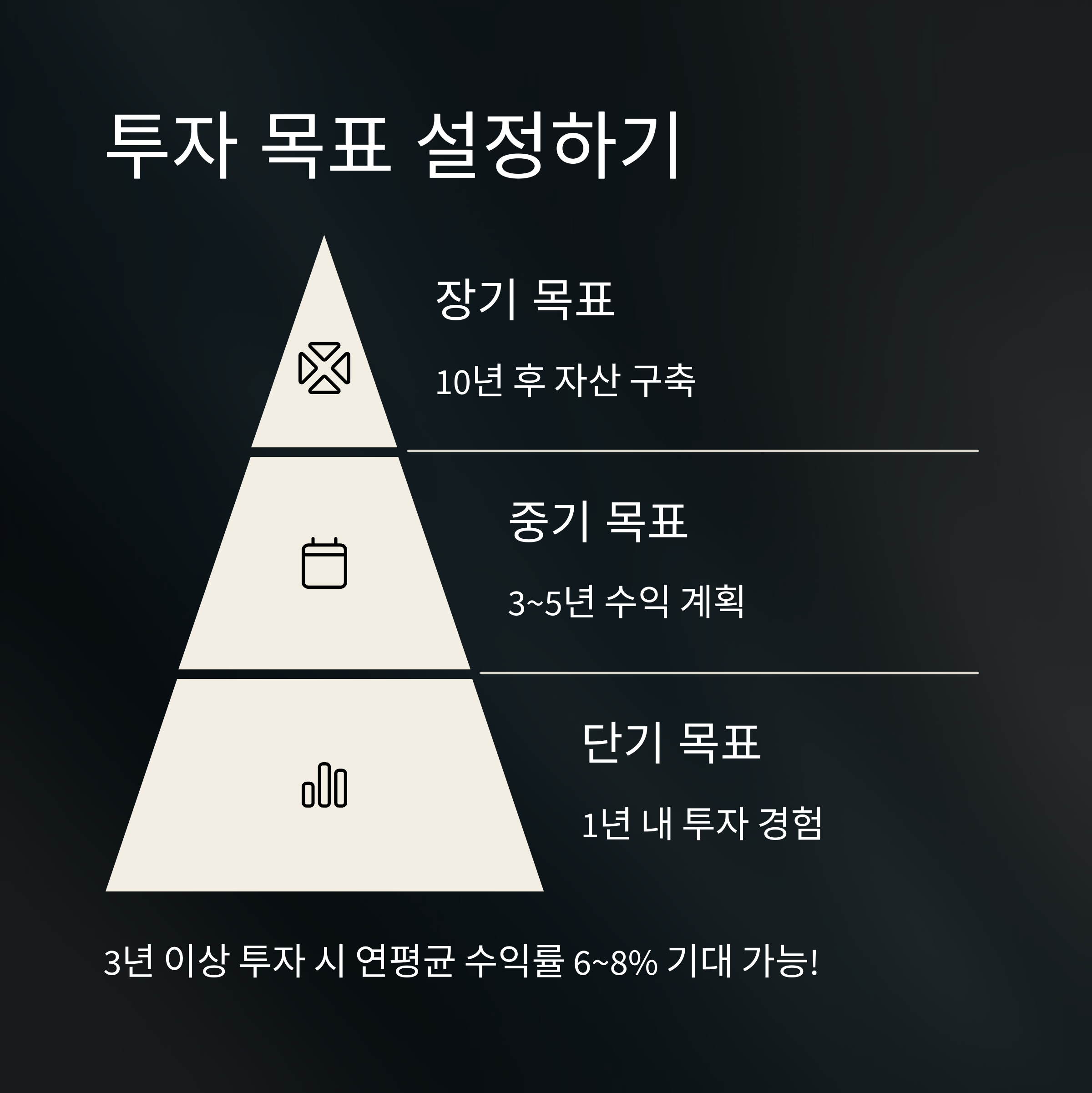 예를 들어 노후 자금 마련인지, 단기 수익 창출인지 분명히 설정해 보세요.