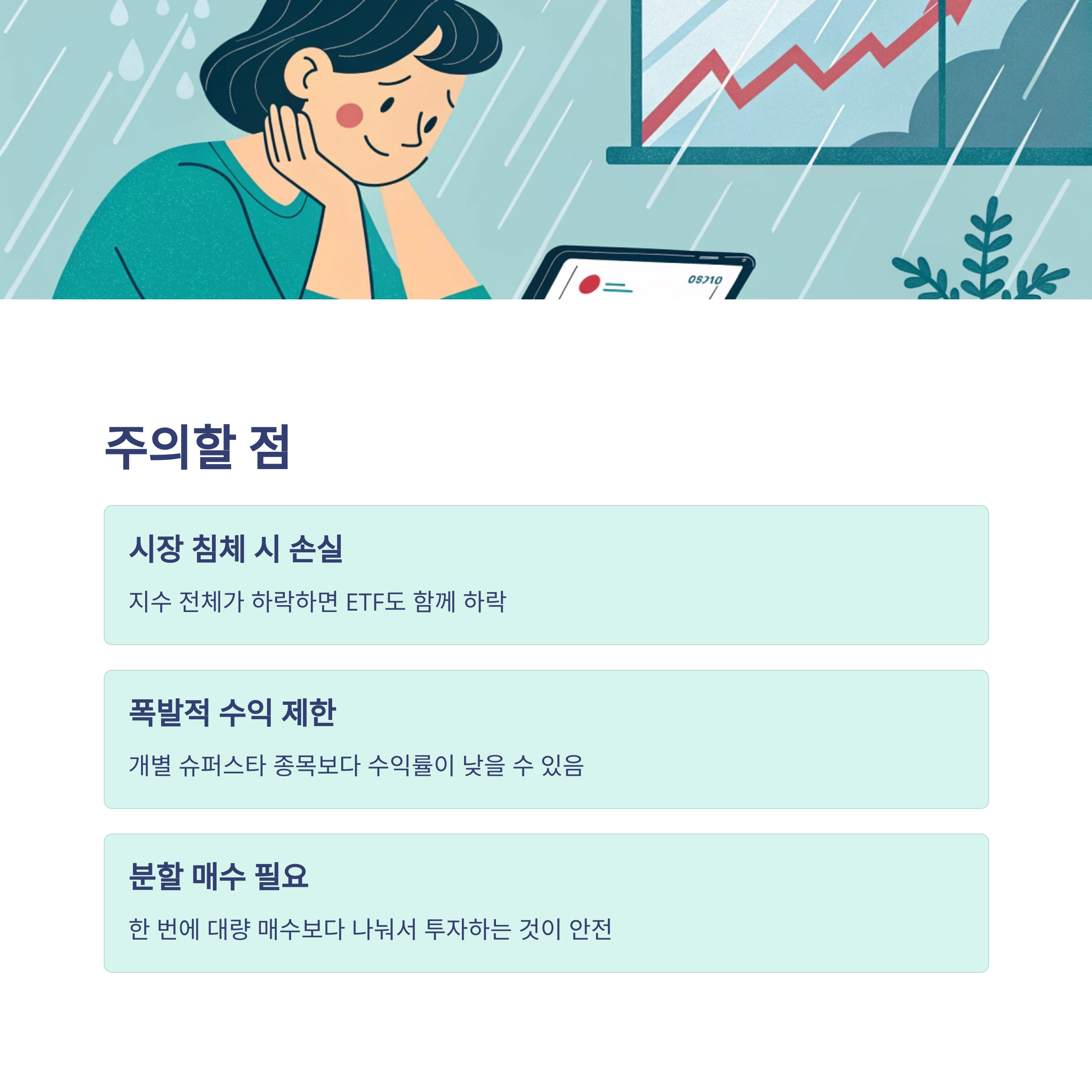 A. 지수 전체를 따라가므로, 시장이 침체하면 그대로 손실을 봅니다. 초고수익을 기대하는 투자자에게는 아쉬울 수 있습니다.