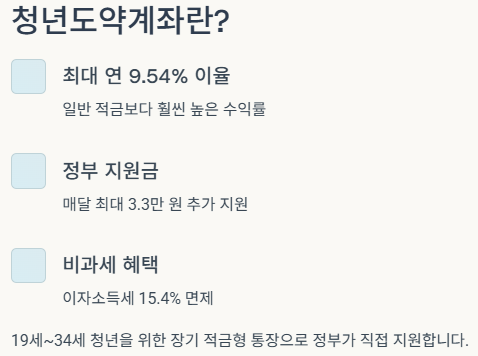 청년도약계좌는 19세 이상 34세 이하 청년에게 자산 형성을 지원하기 위해 만들어진 장기 적금형 통장입니다.
