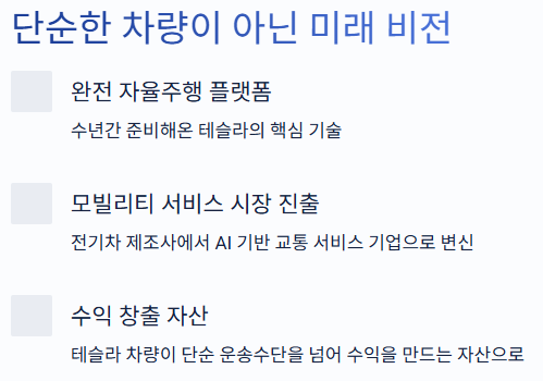 이는 테슬라가 수년간 준비해 온 완전 자율주행 플랫폼과 모빌리티 서비스 시장 진출을 의미합니다.