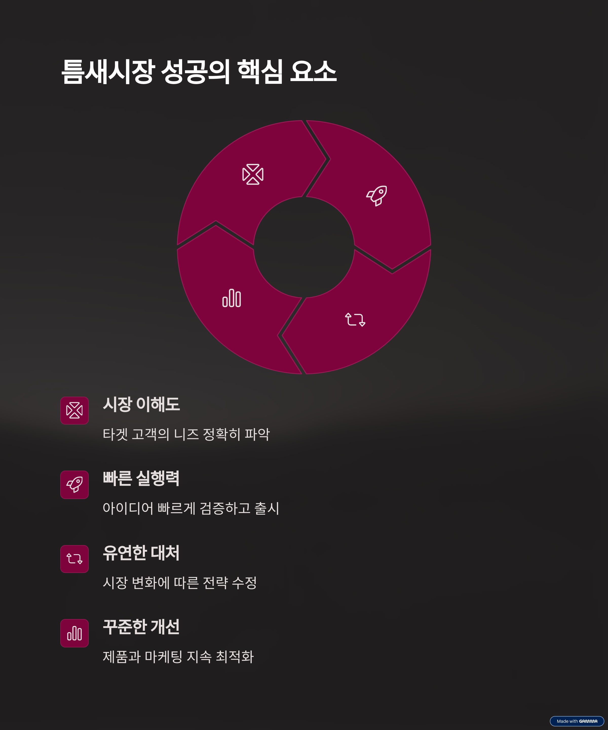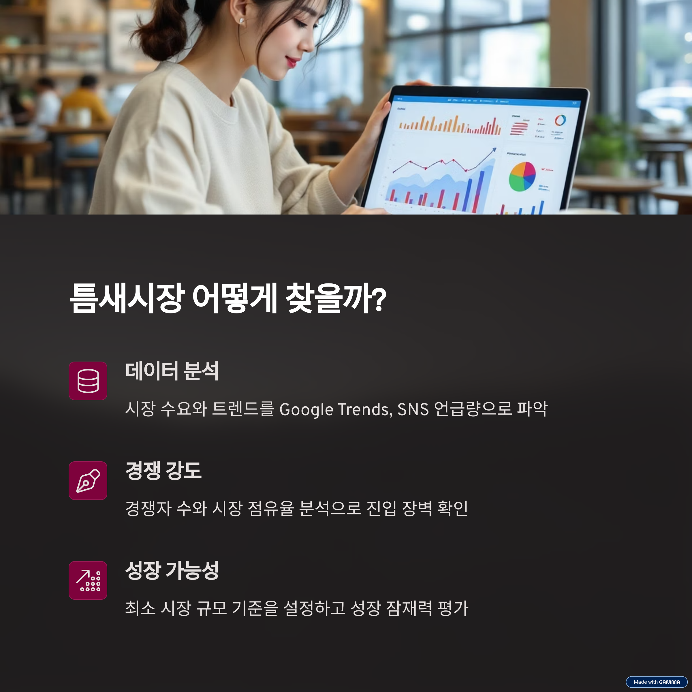 | 틈새시장 | 데이터 분석 | 실행력 |