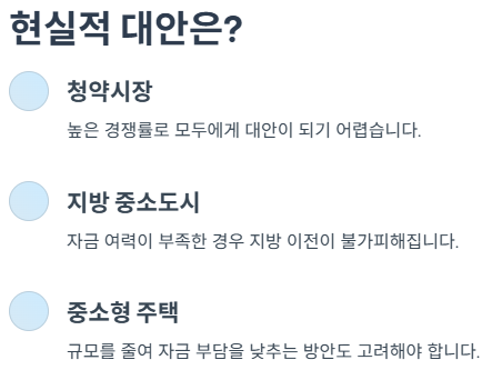 수도권 내에서 주택 구매가 어려워진 만큼, 청약시장이나 지방 중소도시로 눈을 돌리는 경향이 커질 것으로 보입니다. 다만 청약 역시 경쟁률이 높아 누구나 대안으로 삼기엔 어려움이 있습니다. 자금 여력이 부족한 경우, 지방 이전이나 중소형 주택 선택이 불가피해지는 현실이 다가오고 있습니다.