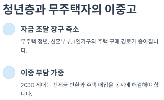 기존에는 무주택 실수요자에게 일부 규제 완화 혜택이 있었지만, 이번 정책에서는 전면 적용됩니다. 이는 자금력 없는 실수요자에게도 동일한 제약이 가해진다는 뜻이며, 시장에서는 "정부가 실수요와 투기 수요를 구분하지 못하고 있다"는 비판이 나옵니다. 결과적으로 무주택자의 내 집 마련 시점은 더 늦어질 수밖에 없습니다.