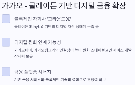 | 카카오 | 블록체인 플랫폼 | 디지털 금융 연계 확장 |