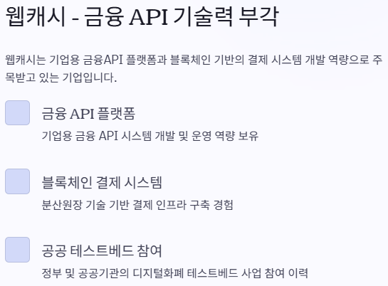 | 웹캐시 | 금융 API | 정부 사업 참여 경험 |