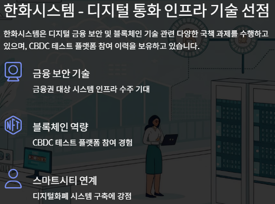 | 한화시스템 | 보안·인프라 | 국책과제·CBDC 실증 |
