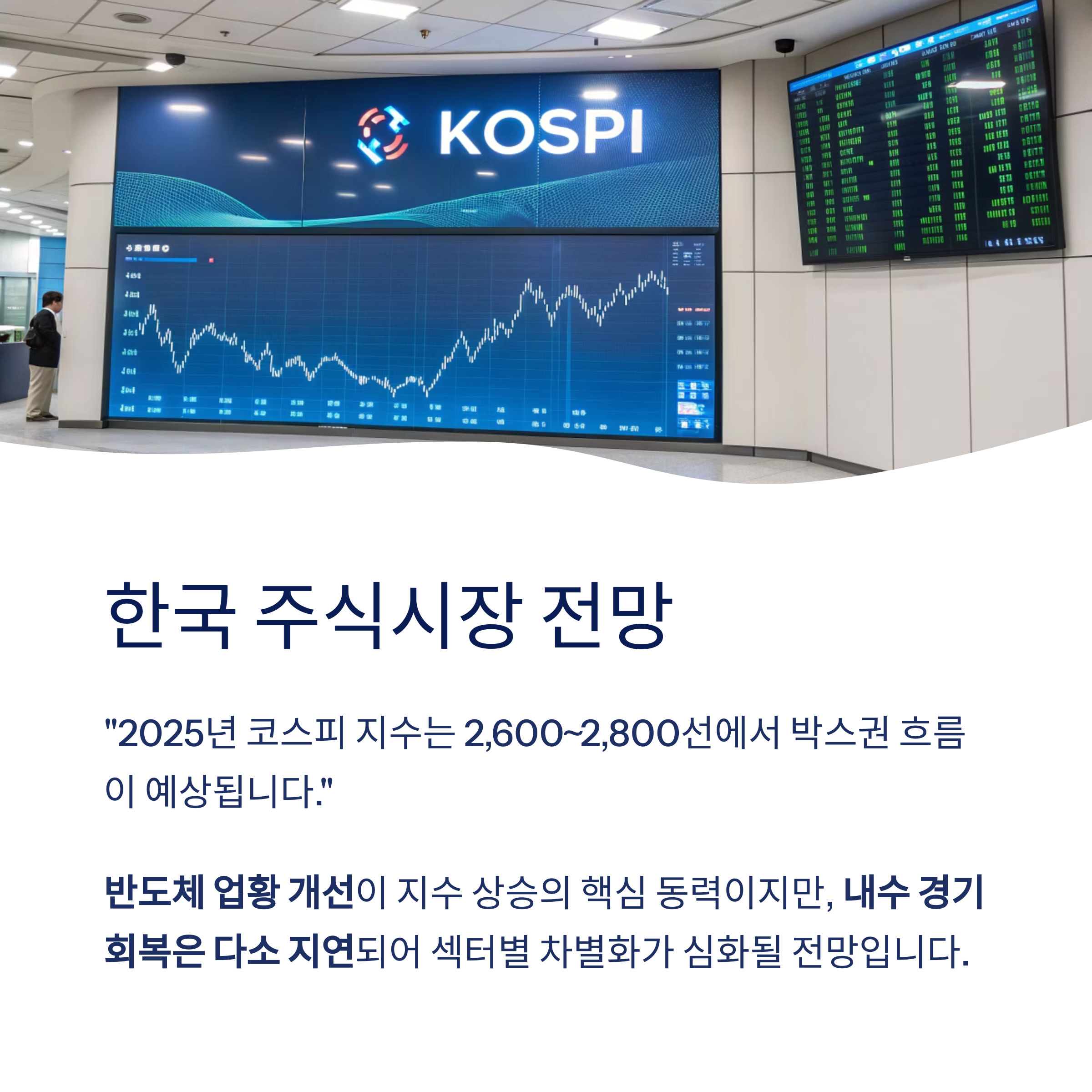 "2025년 코스피 지수는 2,600~2,800선에서 박스권 흐름이 예상됩니다."