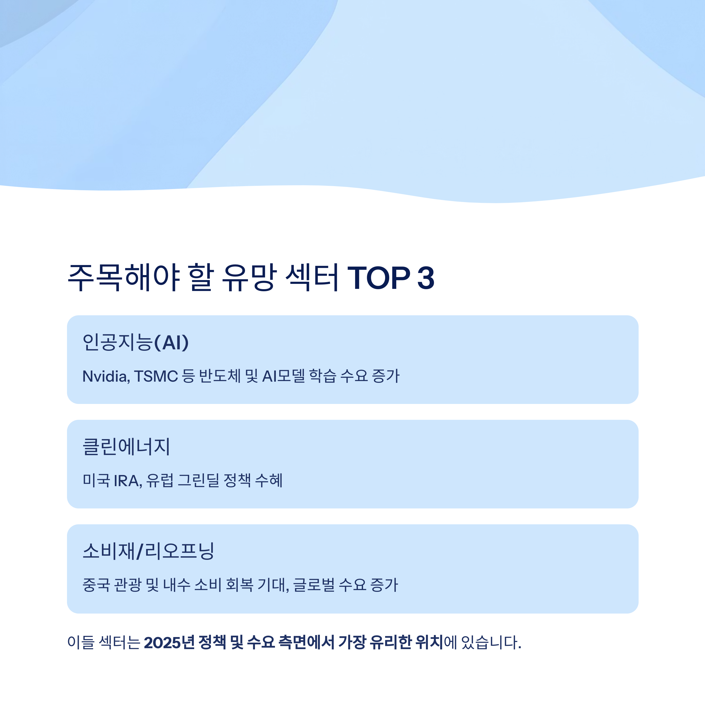 이들 섹터는 2025년 정책 및 수요 측면에서 가장 유리한 위치에 있는 분야입니다.
