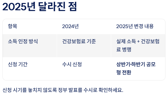 | 소득 인정 방식 | 건강보험료 기준 | 실제 소득 + 건강보험료 병행 |