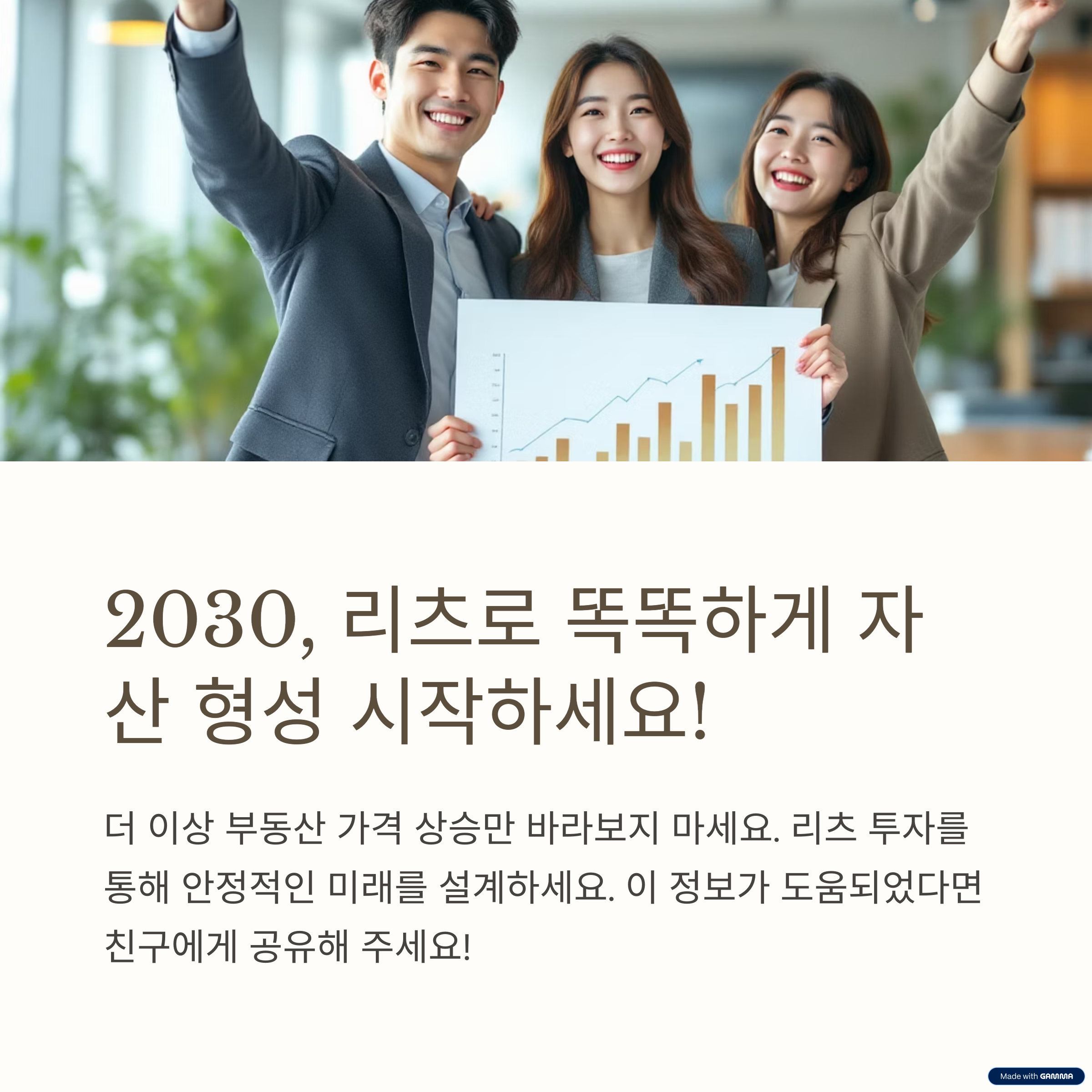 2030 세대는 변화에 민감하고 유연하게 대응하는 세대입니다. 전통적인 부동산 투자에서 벗어나, 더 합리적이고 스마트한 투자 방식으로 리츠를 선택하는 이유는 분명합니다. 낮은 진입 장벽, 안정적 수익 구조, 그리고 분산 투자를 통한 리스크 회피는 오늘날 금융 시장에서 매우 중요한 요소입니다. 앞으로도 리츠 시장은 더욱 성장할 것이며, 젊은 세대는 그 흐름의 중심에 설 것입니다. 지금부터라도 리츠에 대한 이해를 넓히고, 자신의 투자 전략에 적용해보는 것을 추천드립니다.