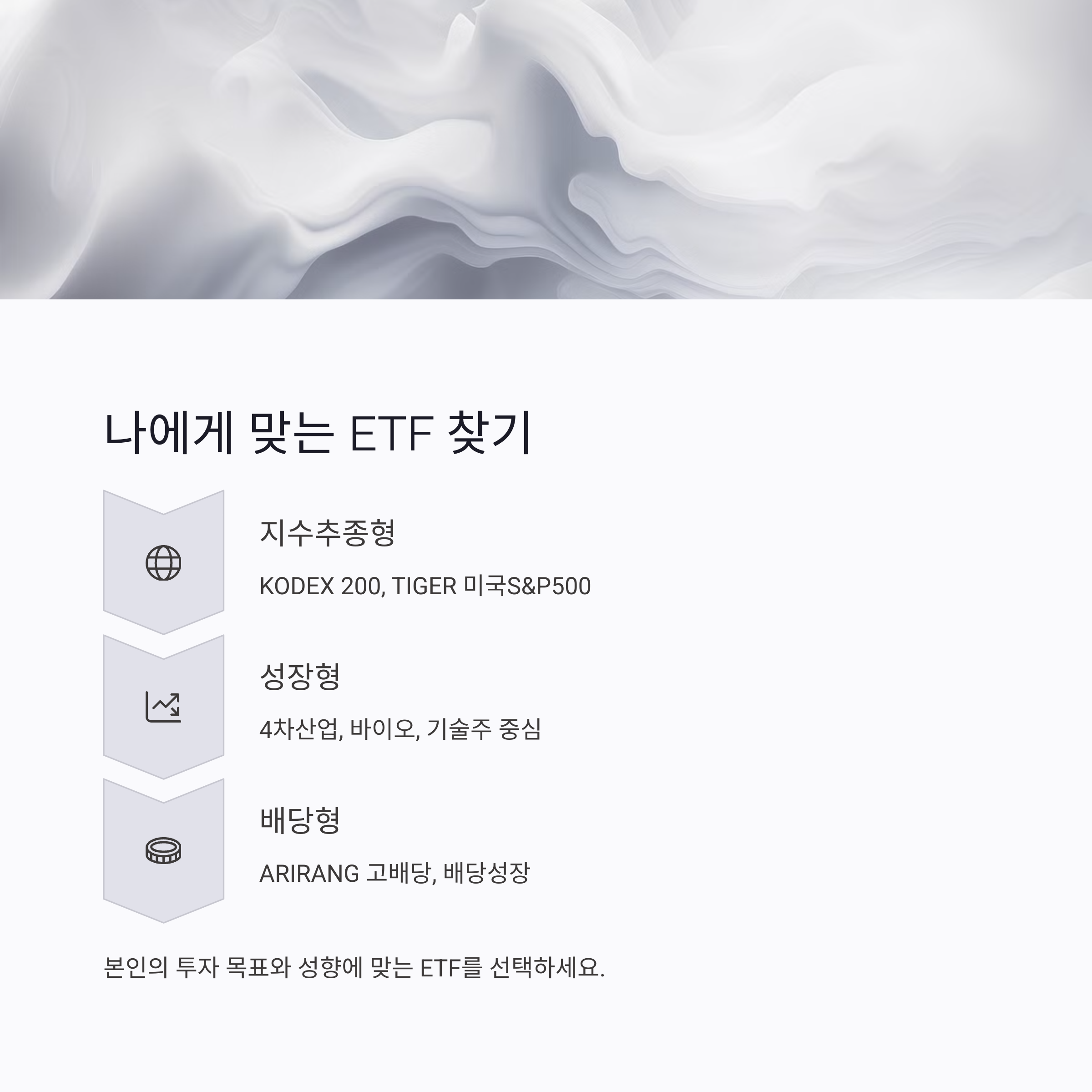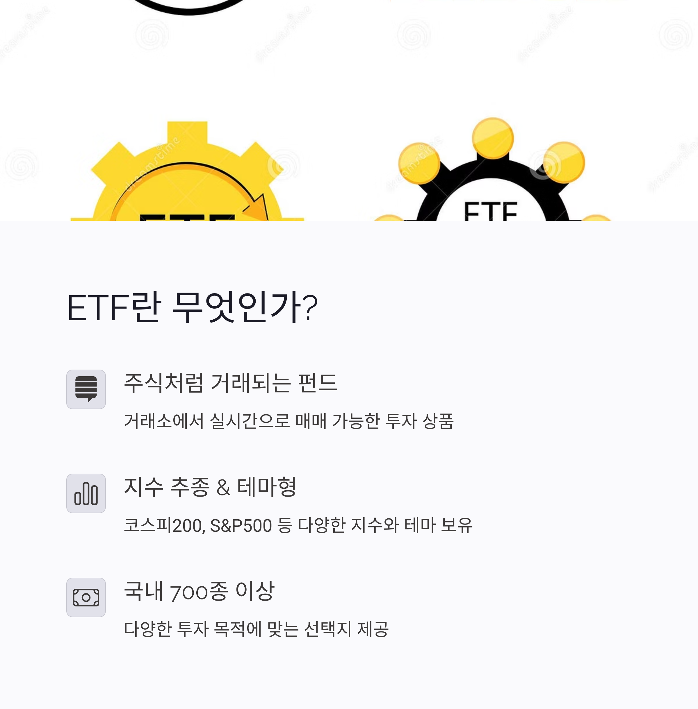 특정 지수나 자산을 추종하며, 하나의 ETF를 사는 것만으로 다양한 종목에 분산 투자할 수 있습니다.